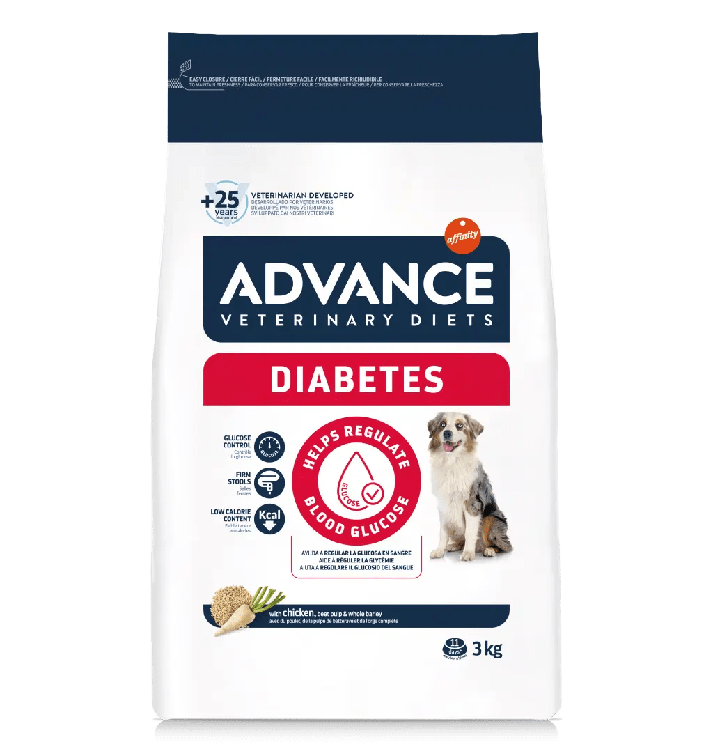 ADVANCE VETERINARY DIETS DIABETES is a complete dietetic product for adult dogs, formulated to control the supply of glucose (diabetes mellitus) and counteract maldigestion by providing low levels of fast-release carbohydrates, highly digestible ingredients and reduced levels of fat. Its high soluble-fibre content facilitates intestinal transit and stimulates friendly gut flora. In addition, its low-calorie formula helps control your dog’s weight.