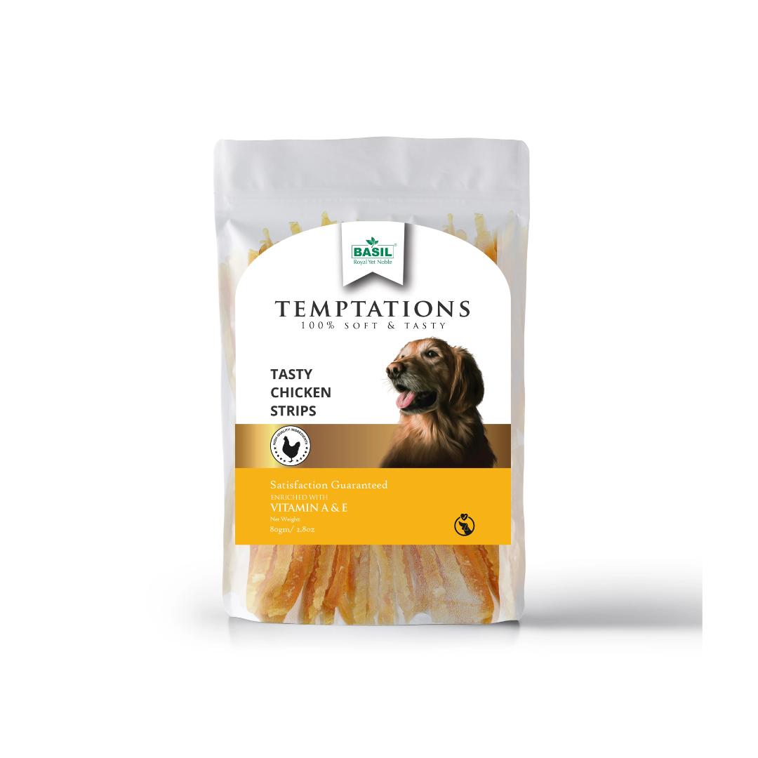 Basil Temptations Chicken Strips are treats for pets made with high quality chicken breast. Reward your pooch with the rich, meaty flavour of genuine chicken from a delicious protein source that dogs instinctively crave. The treats are added with vitamins E and A that helps in your pets’ easy digestion. It has everything you’d expect from a quality treat, and none of the extras you don’t want, like grains, by-product meals or artificial preservatives, colors or flavors. Basil’s Temptations is a delicious, mouth watering snack that’s perfect for treating the entire pack.