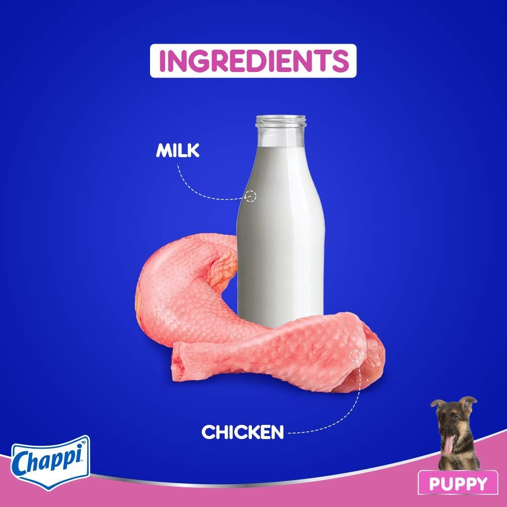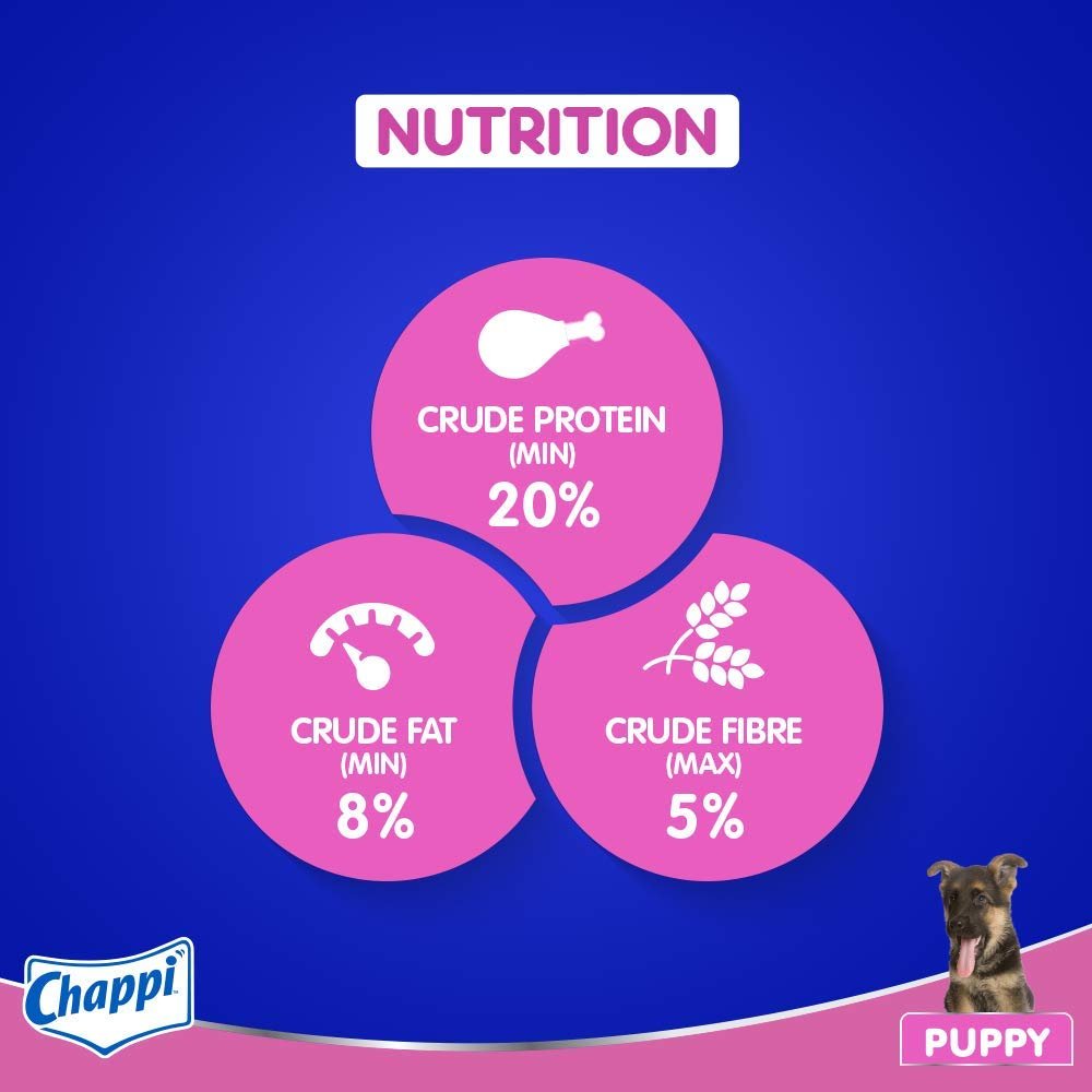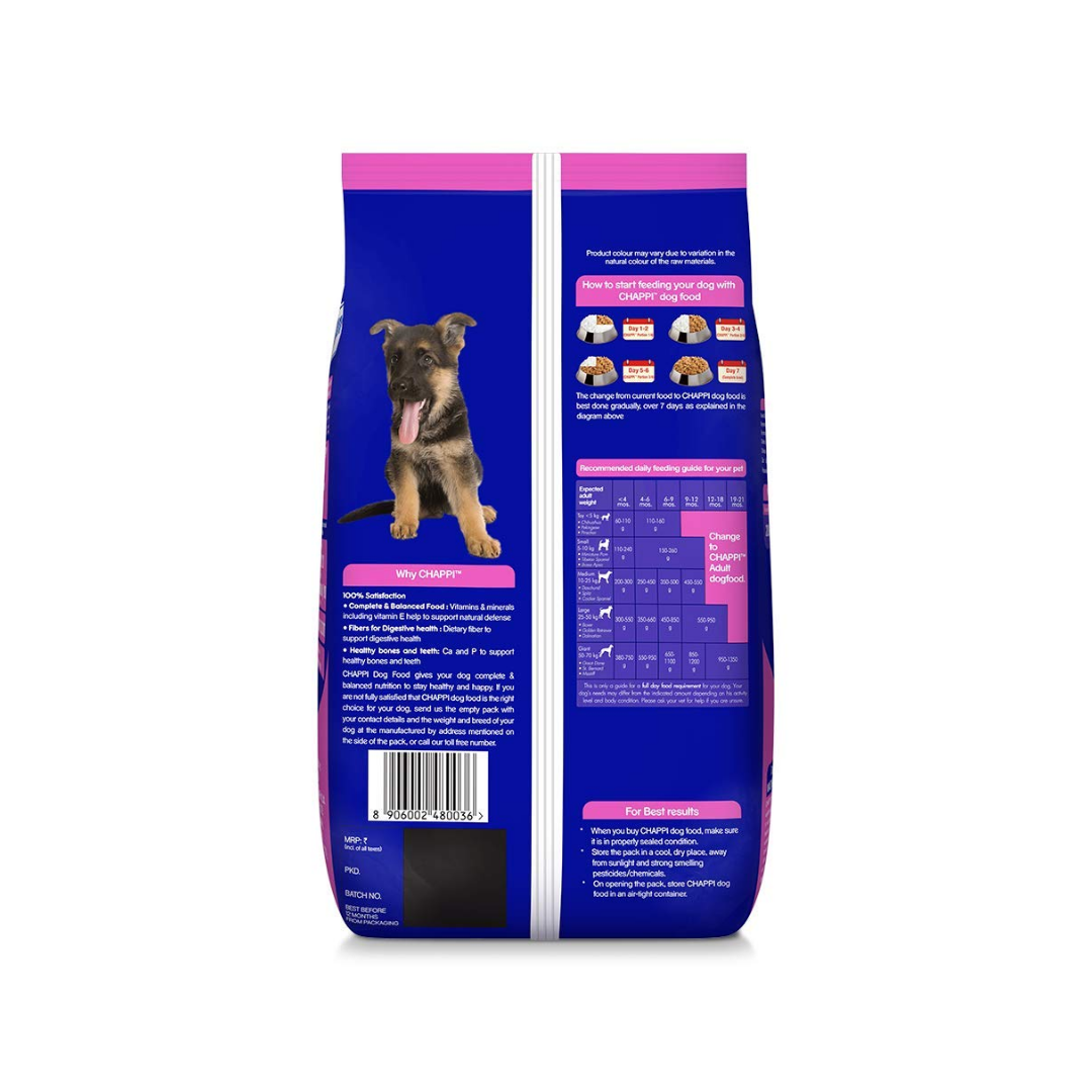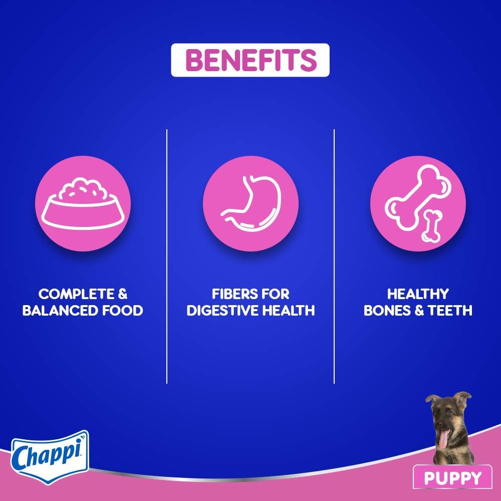 Complete and balanced food for puppies. Provides dogs dietary fiber to support digestive health. It Contains Ca and P to support healthy bones and teet. Vitamins and minerals in dog food including Vitamin E helps to support natural defense. Chappi is suitable for all breeds including Pugs, Beagle to Labrador, Golden Retriever & German shepherd. Formulated by research done by the Waltham Centre for Pet Nutrition.