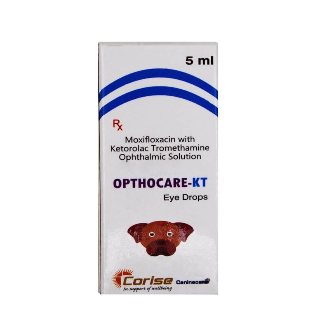 Opthocare – KT eye drops contain moxifloxacin and ketorolac tromethamine. It is a topical Anti-infective and anti-inflammatory eye drop combination for dogs and cats. 1 Drop in the affected eye(s) 3 times daily for 7 days for bacterial conjunctivitis in adults and not recommended to pets below the age of 1 year.