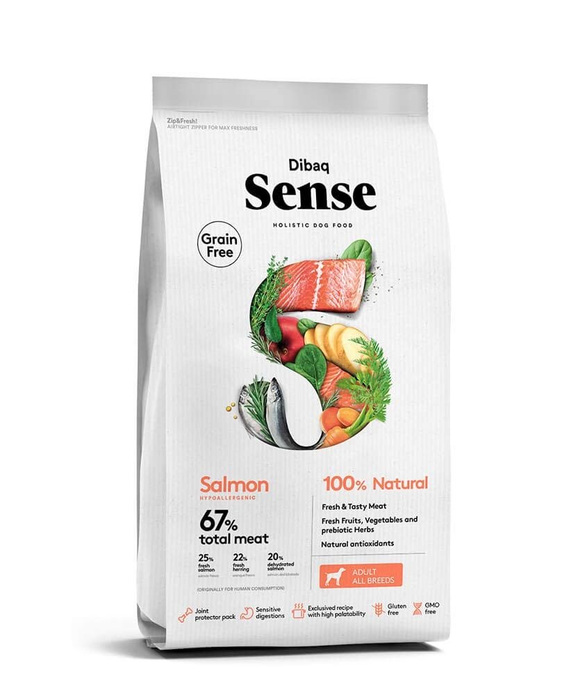 Grain-free food for adult dogs of all breeds prepared with salmon that helps the immune system and improves the coat. ANALYTICAL CONSTITUENTS: Crude protein 26%, Crude oils and fats 15%, Crude fibre 2.8%, Inorganic matter 5.9%. COMPOSITION: Fresh salmon 25%, fresh herrings 22%, dehydrated salmon 20%, potato, shelled peas, chicken oil, beet pulp, dehydrated marine zooplankton, salmon hydrolysate, fresh vegetables and fruit 4% (spinach, carrots, apple), Ceratonia siliqua, salmon oil (source of omega 3 and 6 fatty acids), mineral substances, joint protector pack (chondroitin sulphate, glucosamine sulphate and MSM), yucca, chicory root (source of inulin-FOS), yeasts (MOS) and aromatic plants with natural antioxidant properties (rosemary, thyme and oregano).