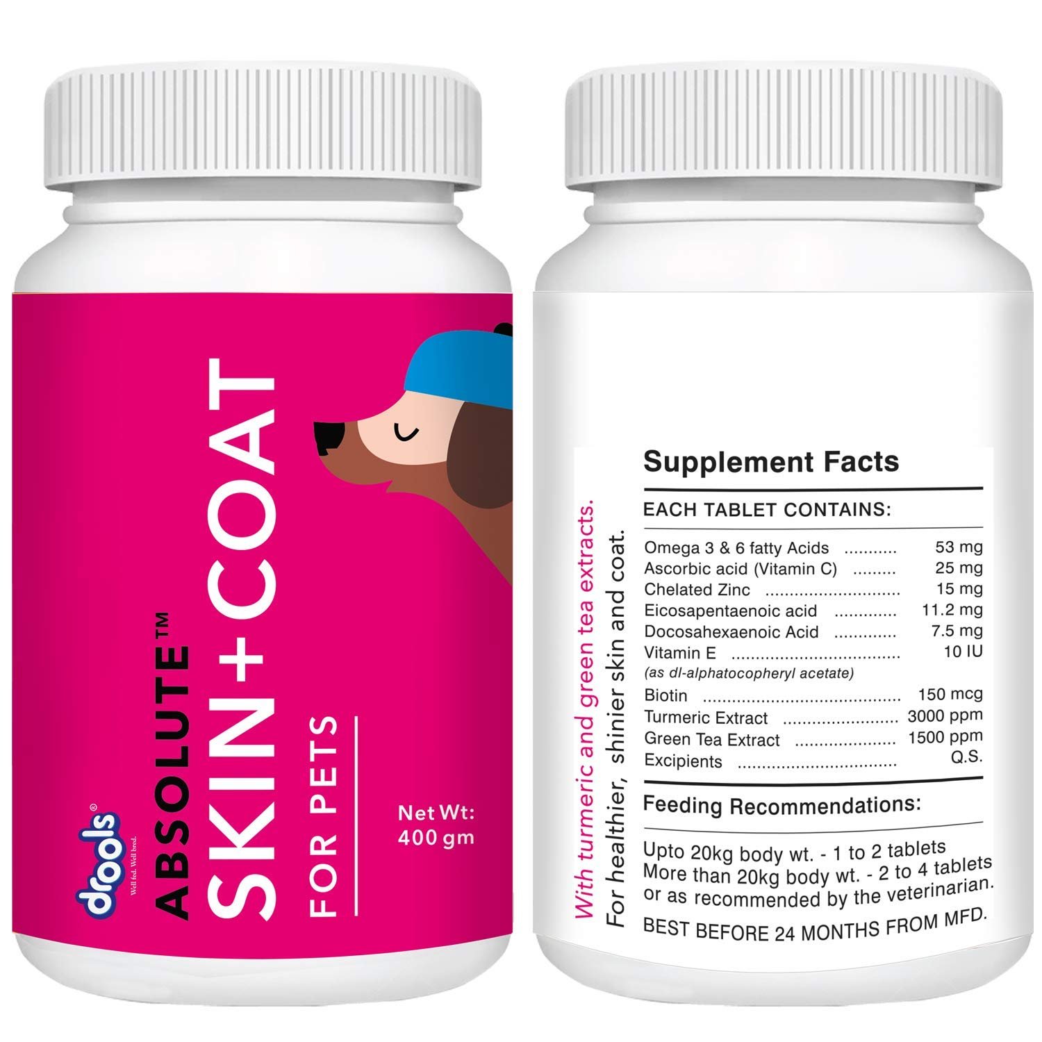 Essential ingredients blended with other nutrients helps in protecting the skin and coat of your dog.Administration of this dog supplement is easy hence pet parents of fussy eaters feel relaxed.Drools Absolute Skin + Coat Tablet is enriched with Omega 3 & 6 for healthy skin and coat.These highly palatable semi-moist kibbles are prepared with turmeric extract and green tea which aids in skin repair
