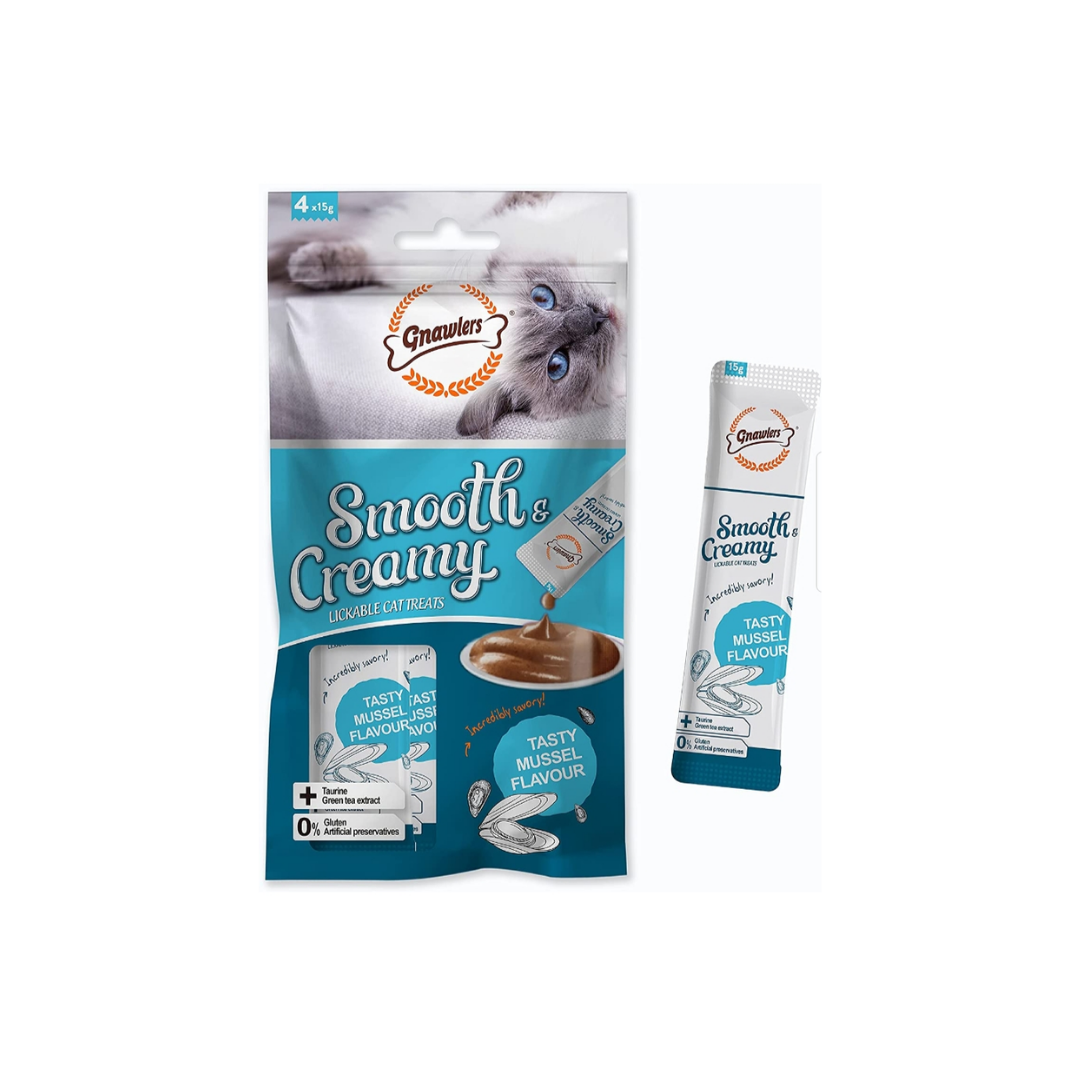 Gnawlers Smooth Creamy Treat with Mussels is a tasty wet treat for your adult cat of any breed. It contains Mussels which is full of flavors and contains highly digestible protein. It contains green tea extract which improves the digestive system. Gnawlers Smooth Creamy Treat with Mussels contains Taurine which improves the eye sight. It contains fatty acids like Omega 6 which improves the skin and fur coat.