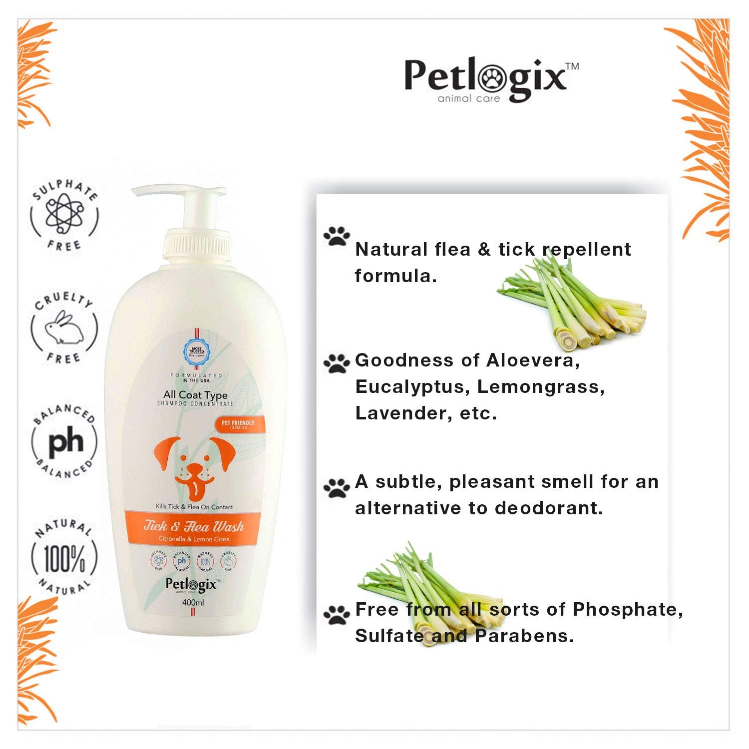 SAY GOODBYE TO TICKS & FLEAS: There’s nothing more annoying for your furry friends than ticks, fleas, and other insects, pests and parasites, but don’t worry; that’s what we are here for. Petlogix Tick and Flea Wash Shampoo will rid pets from all types of allergenic insects and infections quickly and efficiently!Unlike other conventional flea and tick control dog shampoos that have a strong, irritating scent, Petlogix Tick and Flea Wash Shampoo helps to keep insects and parasites away whilst giving a subtle, pleasant smell. No more spending on buying deodorant for your furry friend. It is made without the use of MEA, DEA, Phosphate, Sulfate and Parabens so you can always ensure an irritation-free and no-tear formula. Ideal flea & tick repellent shampoo to gift your furry friend a spa-like treatment at your place.