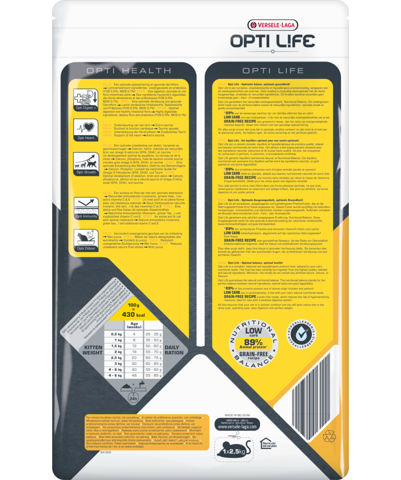 The nutritional composition of Opti Life Kitten supports the optimal development of your kitten’s skeleton, brain and eyesight thanks to the presence of calcium, phosphorous, salmon oil (as a natural source of omega 3 fatty acids EPA and DHA) and taurine.