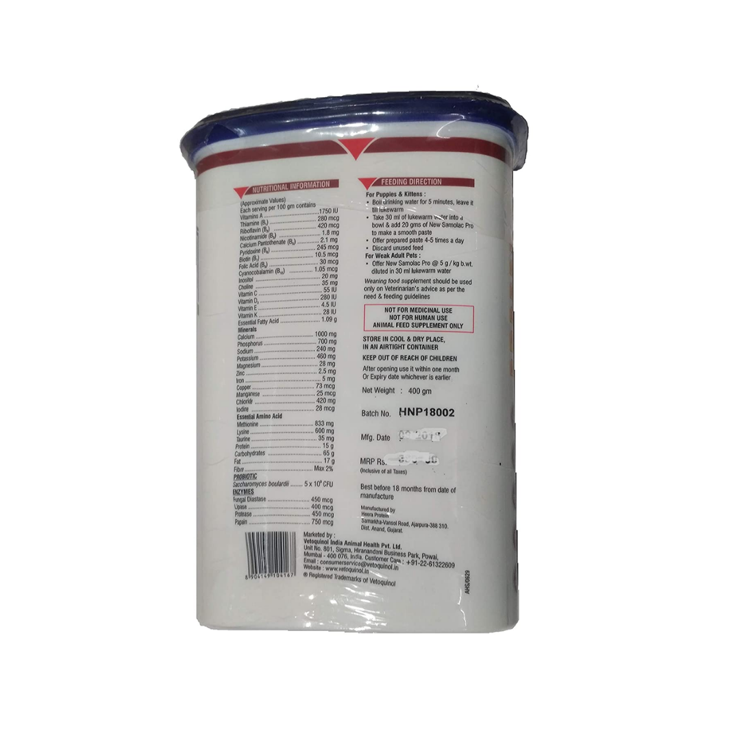 Samolac Pro is a puppy and kitten food which is important for weaning young puppies and kittens. This paste-like feed helps the transition from mother’s milk to food easy and it also meets all the dietary needs of these little puppies and kittens. Samolac contains Whey Protein, Prebiotics and Enzymes that enhances the immunity, improves digestion and provides energy for day to day activity. This puppy and kitten food also meets the nutritional requirement after weaning, it contains saccharomyces boulardii which helps in killing bad bacteria and maintaining the good bacteria, hence improves the gut health. Digestive enzymes support digestive function and reduces gut inflammation. It also contains 10 amino acid, vitamin & mineral for overall body growth and development. Taurine and thiamine in this feed helps in brain development.