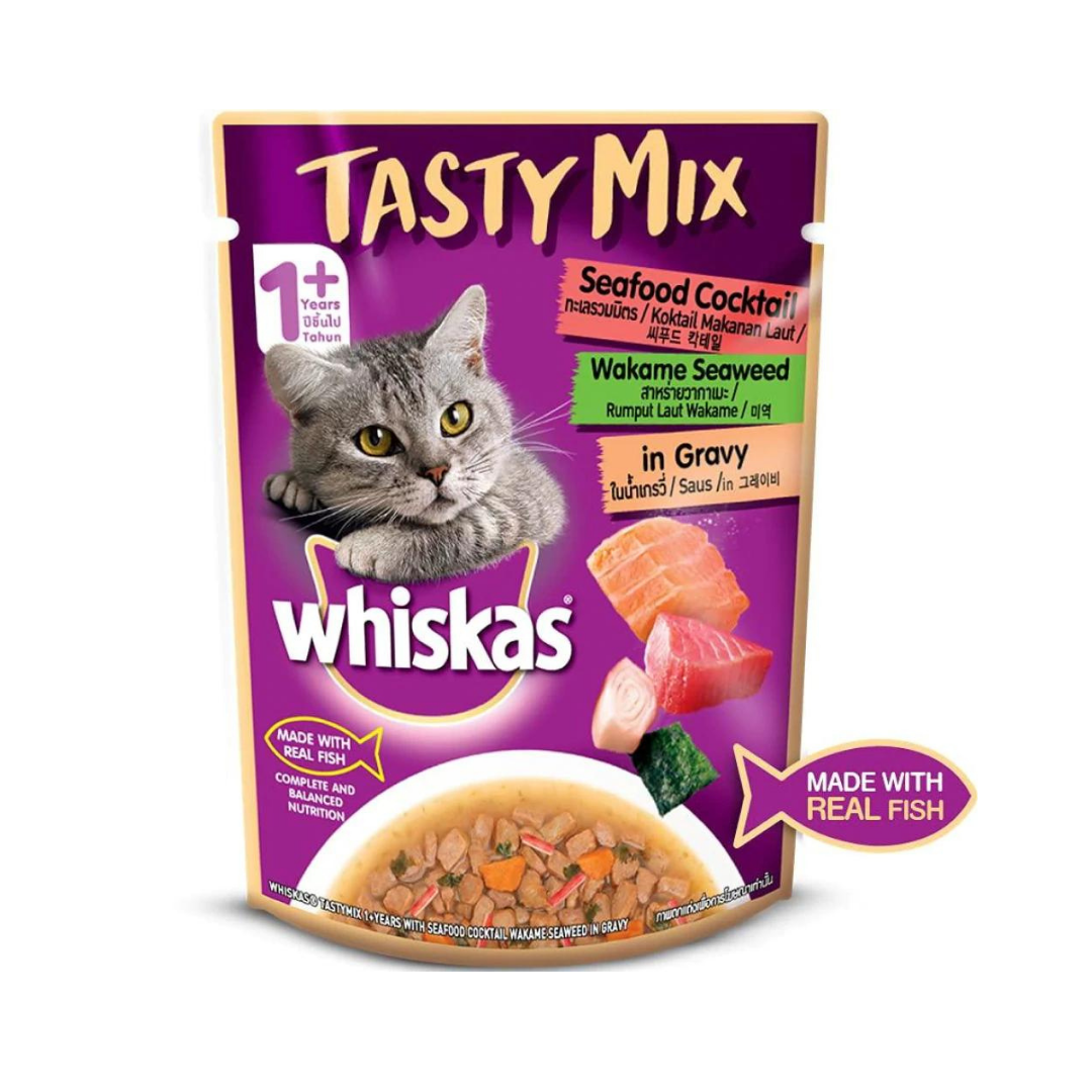 Introducing something new and tasty that is made using varieties of ingredients with complete & balanced nutrition and flavours that your furry friend will love. The new Whiskas Pouch Tasty Mix Seafood Cocktail with Seaweeds in gravy enhances the cat food’s deliciousness by combining quality protein with chicken and nutrition from colourful veggies in tasty gravy sauce. A cat’s love for fish is thoughtfully blended in Whiskas cat food along with 41 essential nutrients to boost their health & energy. This is an ideal gravy food for cats that will make them happy while they also enjoy it.